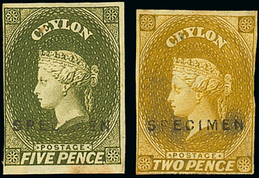 5d. grey-olive and 1867-70 2d. ochre with watermark inverted, both imperforate, handstamped "specimen" (Type D5) and touched or cut-into in places, the 5d. also with small stain in margin at foot. Photo