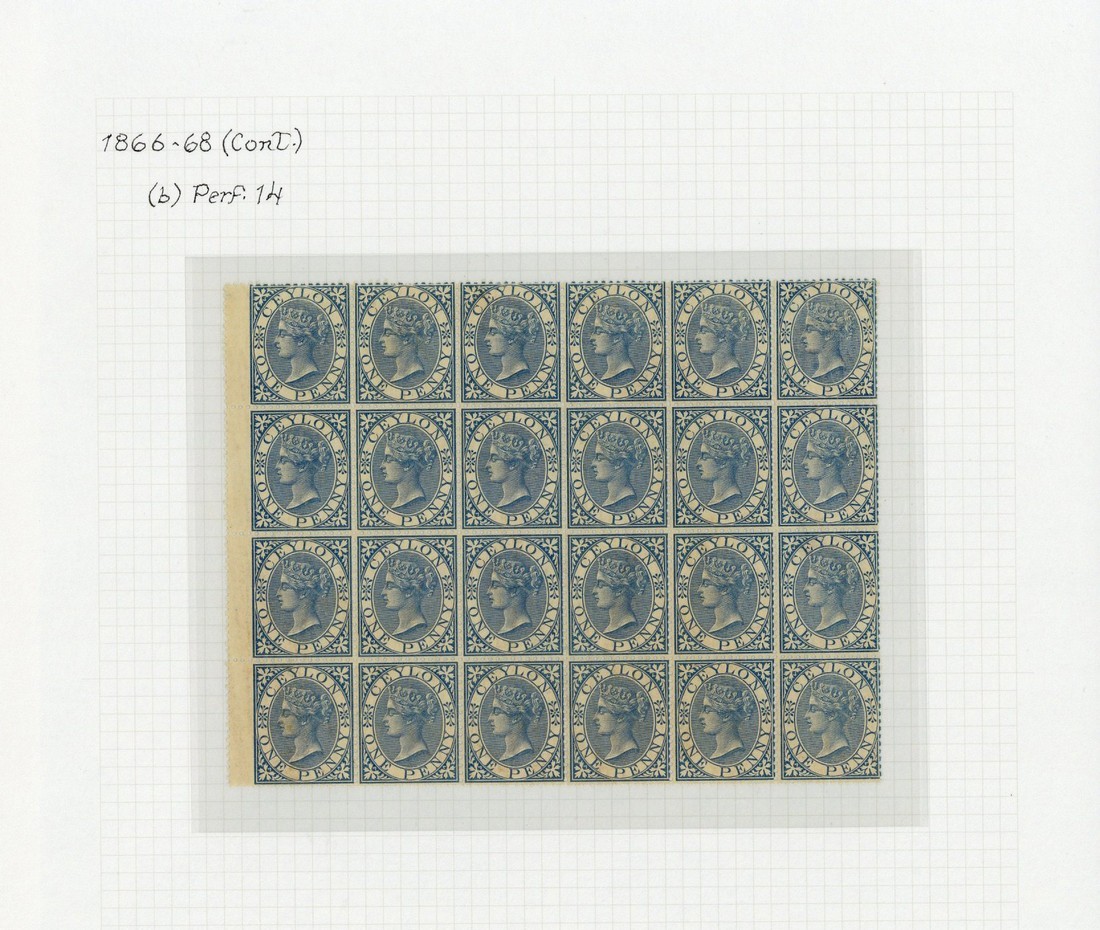 1866-68 1d./3d., a selection comprising perf. 12½ 3d. and perf. 14 1d. (27 with a wing-margin block of twenty four) and 3d. (17 with a wing-margin block of fifteen), part to large part gum; the 3d. block with a few surface marks though generally good to fine. Also 1872-80 32c. overprinted "specimen", S.G. 60-62