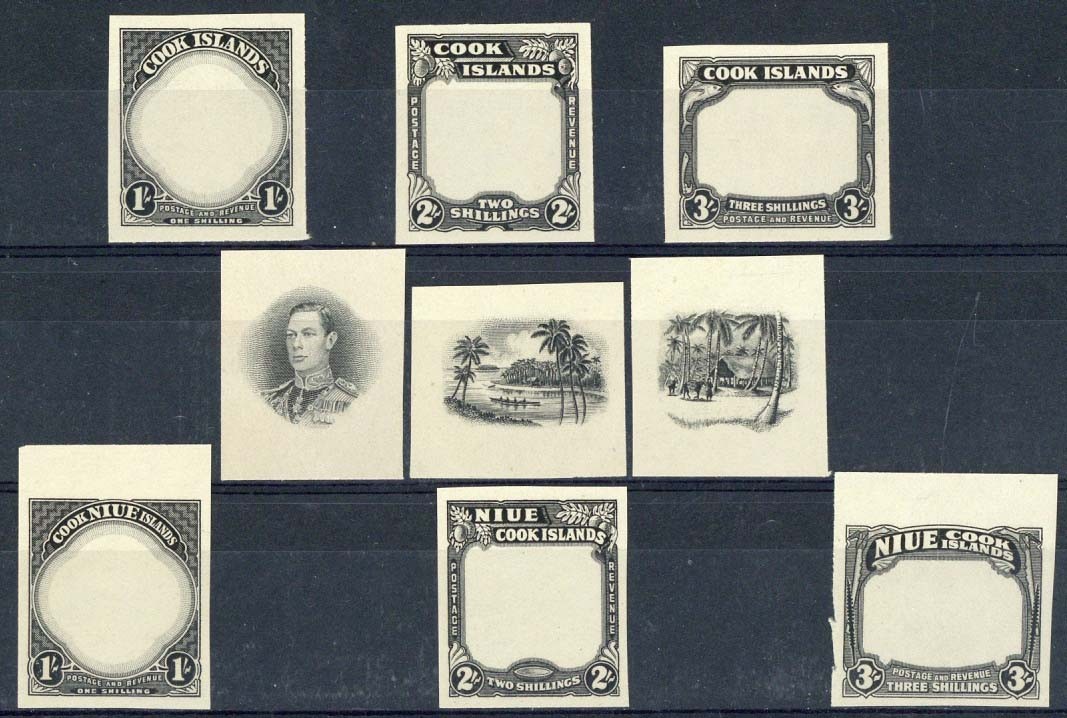 1938 1/-, 2/- and 3/- frame plate proofs, with a similar set for Niue, plus the complete set of three vignette plate proofs, all in black on wove paper. Fine and rare.