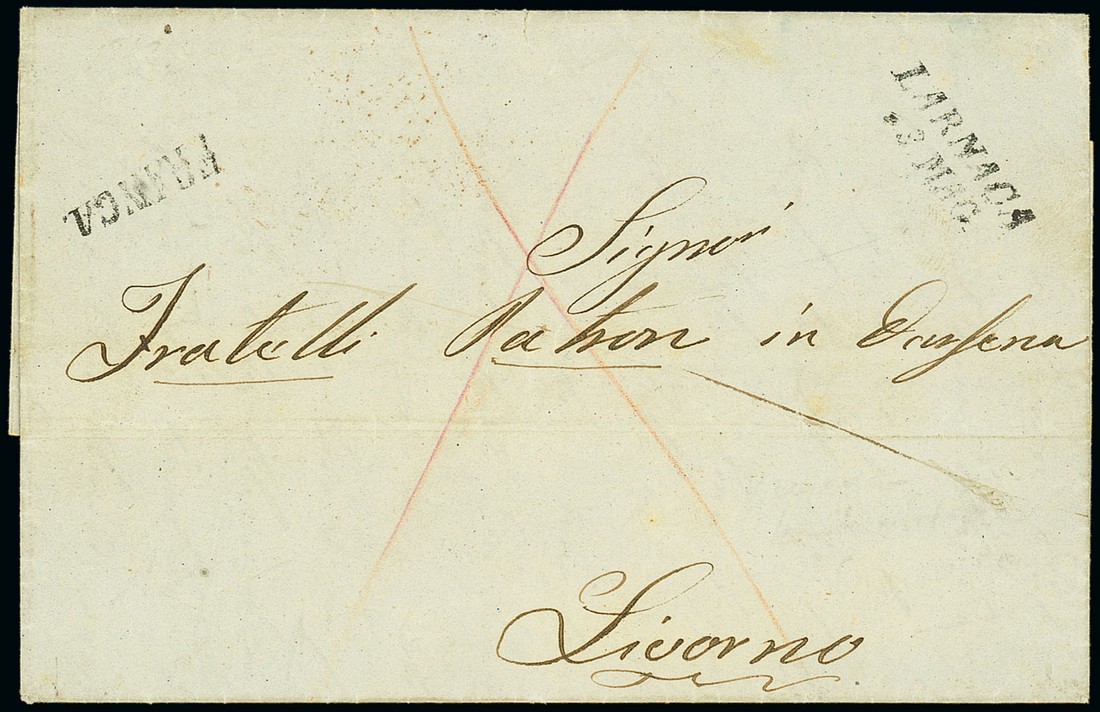 1856 (18 May) entire letter registered to Livorno, face panel with large red cross in red crayon and showing "larnaca/18 mag" datestamp and "franca." handstamp, arrival datestamp (8.6) on reverse. Photo