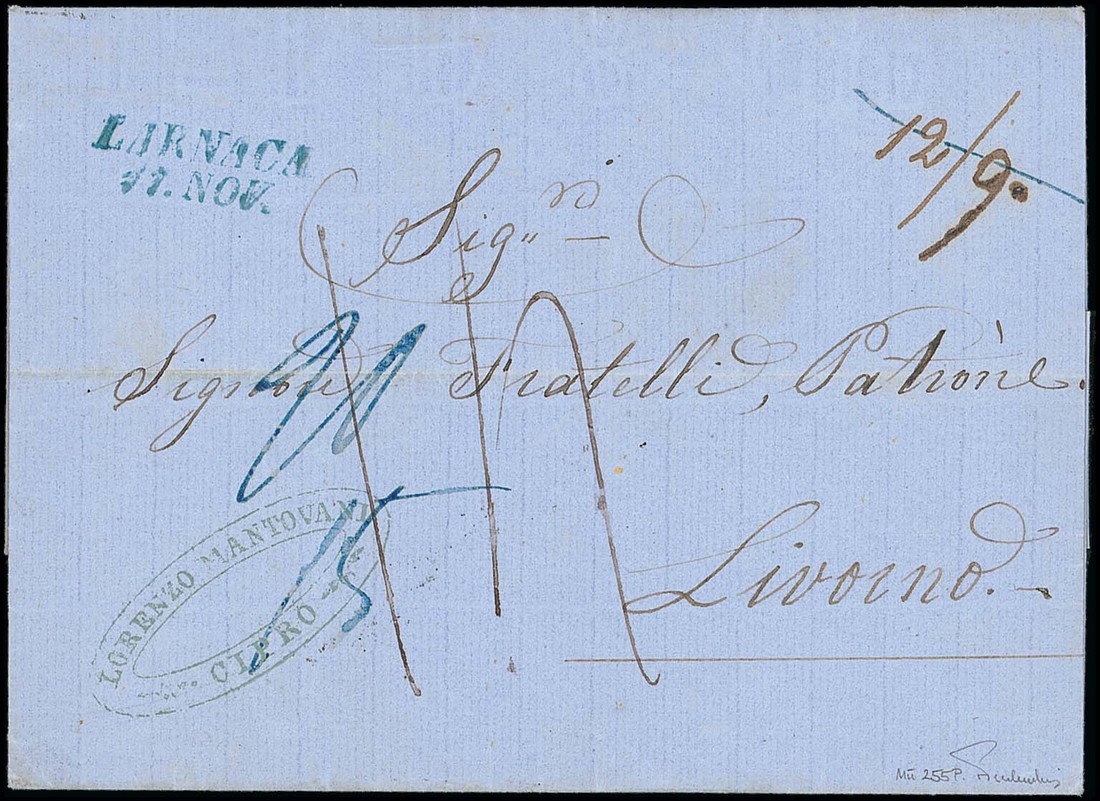1858 (c.) entire letter from Larnaca to Livorno, variously rated and showing a fine strike of the "larnaca/11. nov." datestamp unusually struck in blue, part arrival c.d.s. (date unclear) on reverse; scarce with few examples of this datestamp recorded in blue. Signed Ferchenbauer. Photo