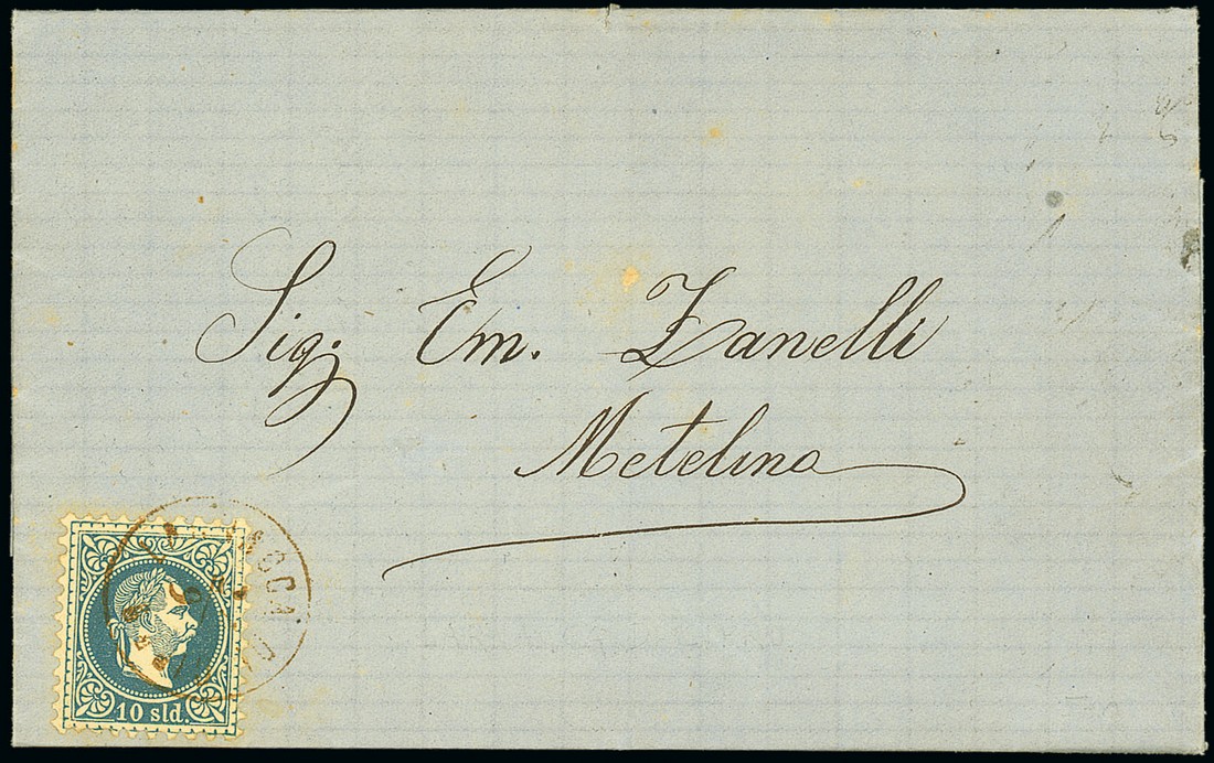 1872 (24 Sept.) entire letter to Metelino bearing 1867 10s. blue (faint ageing at perfs.) neatly cancelled by "larnaca di cipro" c.d.s. in brownish ink; fine. Photo