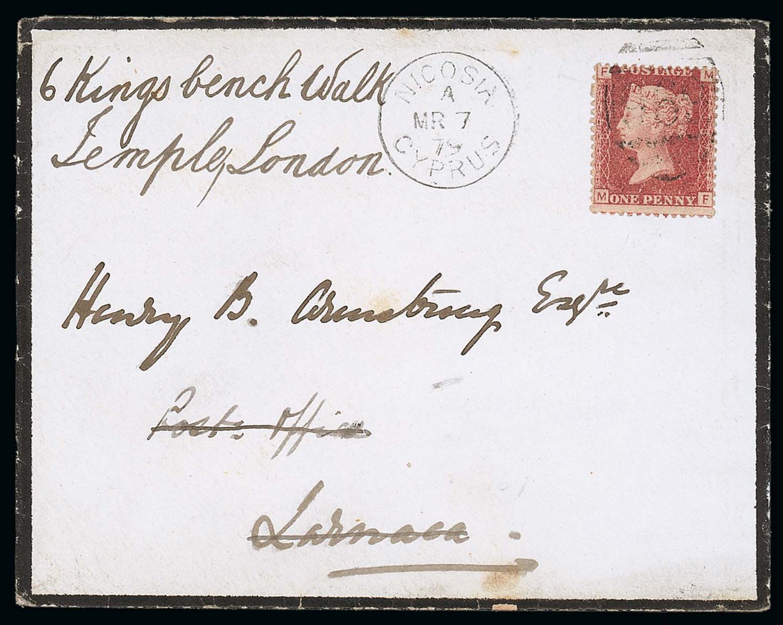 1879 (7 Mar.) mourning envelope from Nicosia to Larnaca, bearing 1d. red Plate 187 lightly cancelled "969" and with fine despatch c.d.s. alongside, upon arrival redirected to London without charge though it should have been charged 1½d. due, the single rate difference between the inland and overseas letter rates, the reverse with Larnaca (7.3) and London (22.3) c.d.s. A fine 1d. inland letter rate cover redirected overseas. Photo