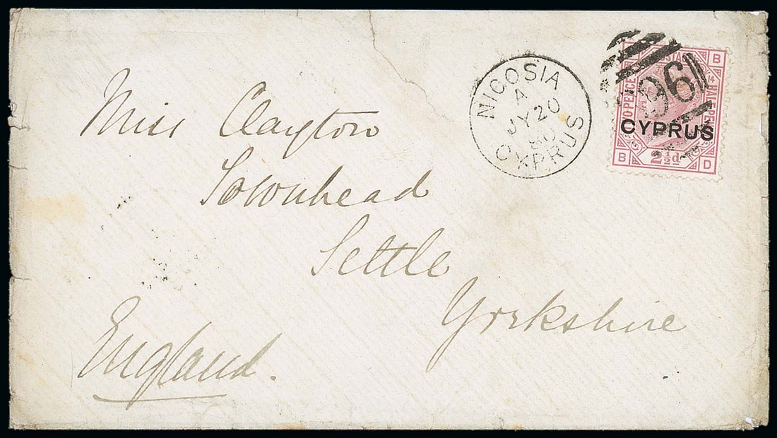 1880 (20 July) envelope (flap missing and closed tear at top) from Nicosia to England, bearing 2½d. rosy mauve cancelled "969" and with fine despatch c.d.s. alongside, Larnaca c.d.s. (20.7) on reverse; attractive. Photo