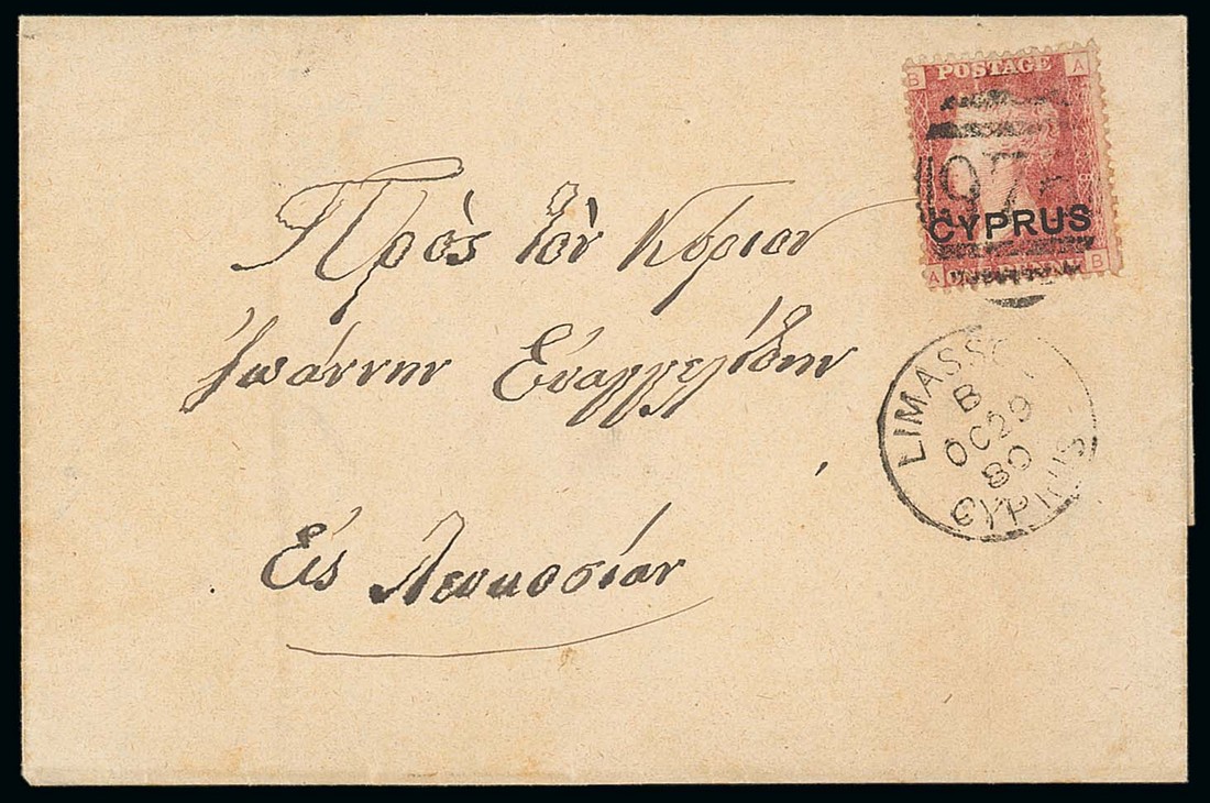 1880 (29 Oct.) entire letter, written in Greek, from Limassol to Nicosia, bearing 1d. red Plate 208 cancelled "975" and with fine c.d.s. below, arrival c.d.s. (29.10) on reverse; two filing creases, one crossing the adhesive, otherwise fine and a scarce inland rate letter. Photo