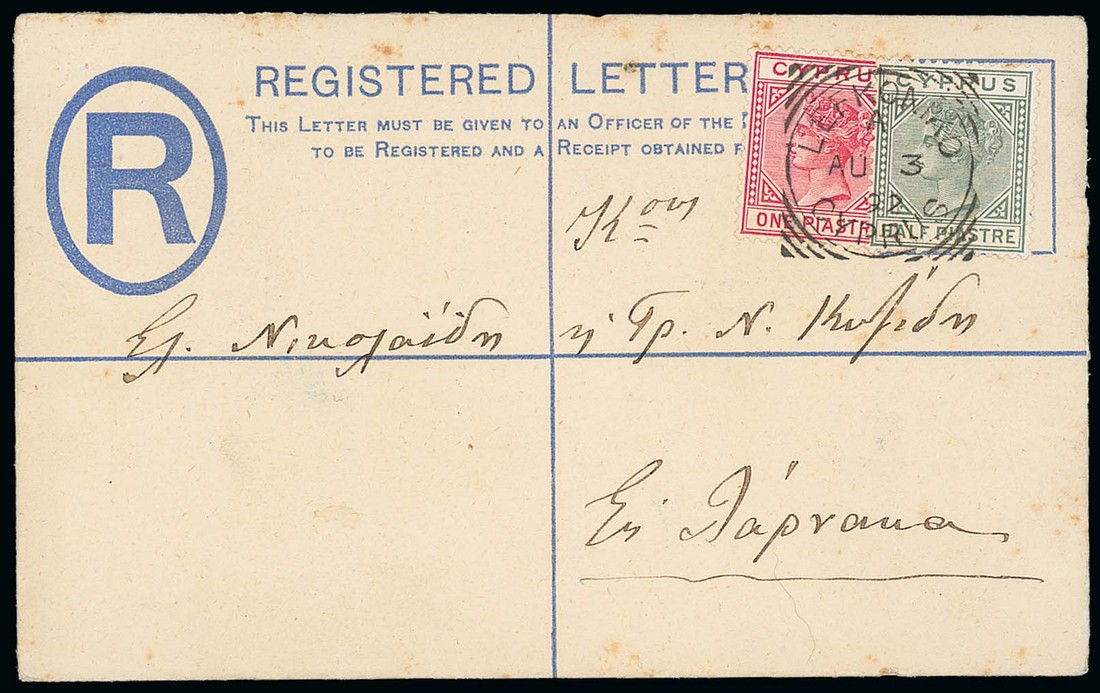 1892 (3 Aug.) 2pi. F size registered envelope from Lefkonico to Nicosia, bearing 1892-94 ½pi. dull green and 1pi. carmine sharing a superb strike, the reverse (flap damaged) with arrival c.d.s. (4.8); a scarce cancellation. Photo