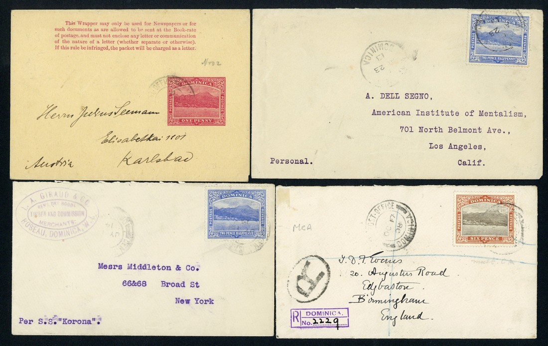 1906-29 envelopes (18, four registered) and a picture postcard, variously addressed and franked including two bearing Leeward Islands values only and one with Dominica/Leeward Islands combination; also a range of loose Leeward Islands stamps used in Dominica and some unused Dominica postal stationery