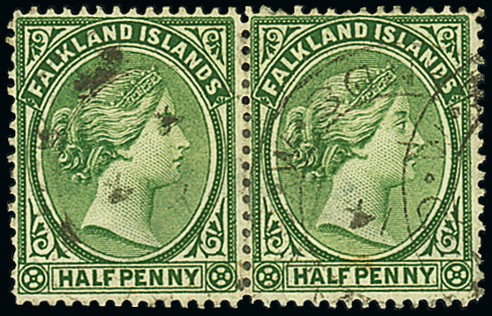 1891-1902 ½d. yellow-green pair with three partial strikes of the West Falkland c.d.s. for 14 July 1902; both stamps thinned though of good appearance. Photo
