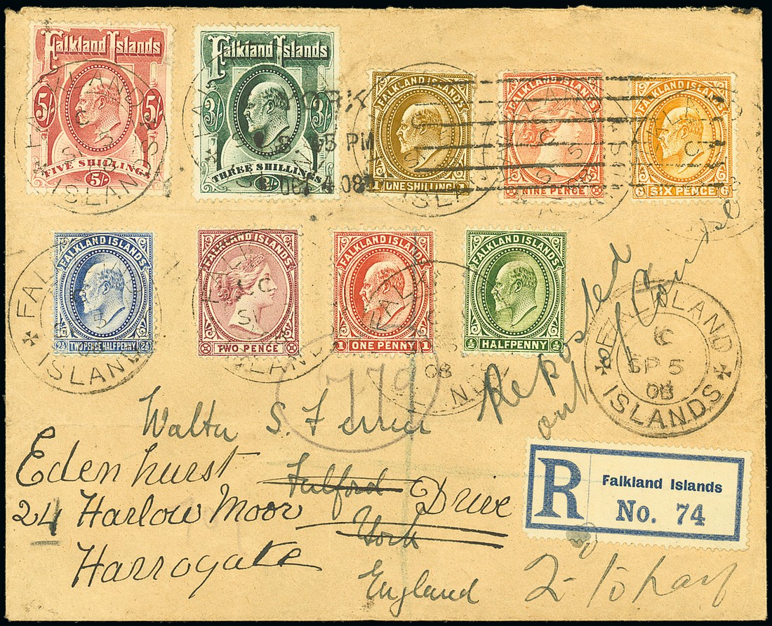 1891-1902 2d. and 9d., and 1904-12 KE ½d., 1d., 2½d., 6d., 1/-, 3/- and 5/-, all tied by "falkland/islands" double-ring d.s. on 1908 (5 Sept.) envelope registered to York and redirected to Harrogate, marked "Reposted, out of Course" and "2d to pay"; some light creases and the 1d. crossed by blue crayon stroke. Photo