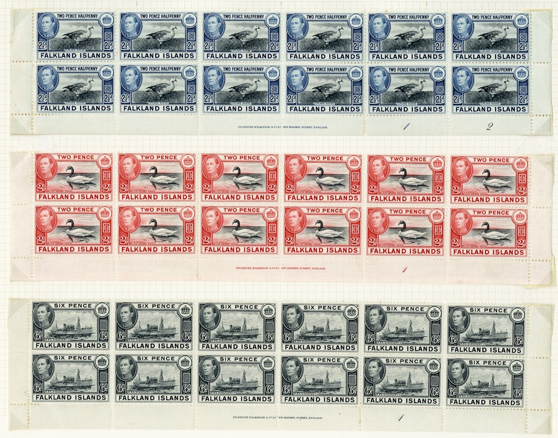 2d., 2½d. and 6d. February 1949 printing (SH80d, 82, 85) blocks of twelve from the foot of the sheet with imprint and plate numbers, and ½d. and 2½d. 1942 printing complete sheets, the 25d. with some perfs. separated and faulty; unmounted mint