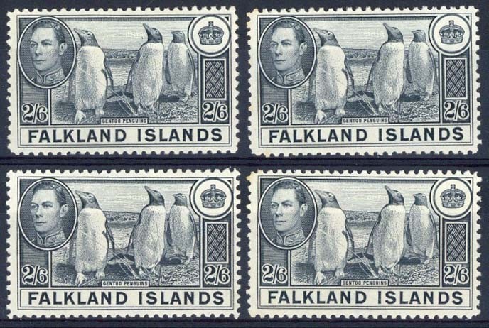 2/6d. slate 1937, 1938 and 944 (2) printings; two with a couple of foxed perfs., otherwise fine mint