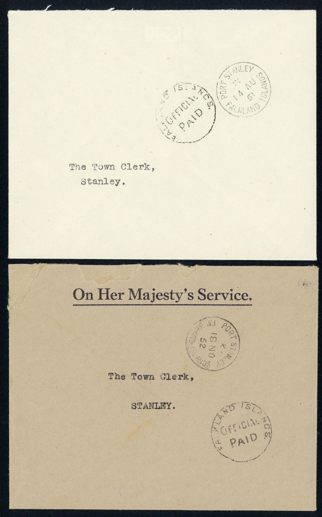 1952 and 1961 envelopes to the Town Clerk at Stanley, both showing Official Paid handstamp (PSO.4) and with arrival c.d.s. (PS.3)