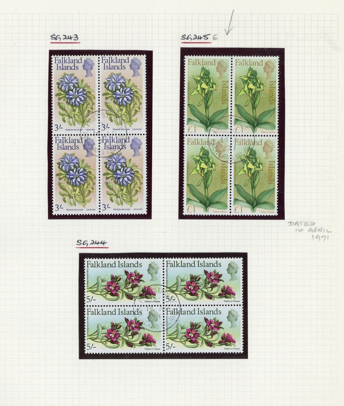 1968 Flowers set in blocks of four with single PS.3 c.d.s. (17.2.69), the set to 1/- in blocks of four with PS.3 c.d.s. on 1968 (9 Oct.) first day covers and the set to 1/- to 1/- in singles with FB.4 c.d.s. on 1969 (7 June) envelope