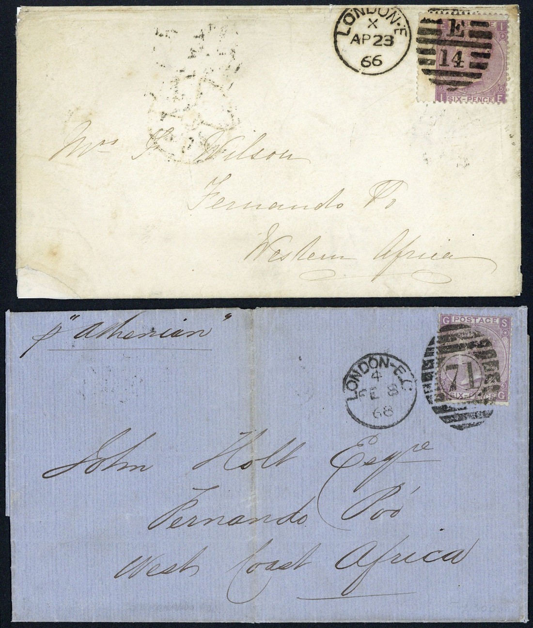 1866 (23 Apr.) envelope from London to Fernando Po, bearing GB 1865-67 6d. Pl. 5, tied by London duplex, and 1868 (8 Feb.) similar entire letter endorsed "p. Athenian", bearing 1867-80 6d. Pl. 6; a few faults otherwise fine