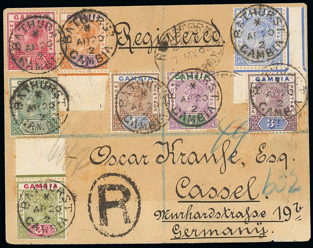 1902 (20 Apr.) envelope registered to Germany, bearing 1898-1902 ½d. to 1/- set of seven, the 3d. being the rare deep purple and ultramarine shade, all cancelled by Bathurst c.d.s. and with "R" in oval handstamp and Liverpool Registered oval datestamp (7.5), all on face, the reverse with Gambia and London Registered oval datestamps and arrival c.d.s. (8.5). The 1902 3d. shade very rare on cover. B.P.A. Certificate (2013). Photo