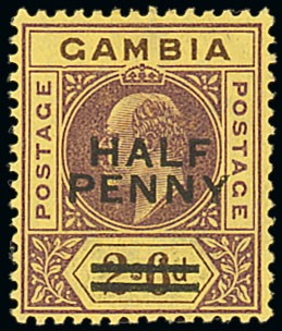 1906 (Apr.) "half/penny" on 2/6d. purple and brown on yellow showing variety dented frame, fine mint. Rare. S.G. 69a, £900. Photo