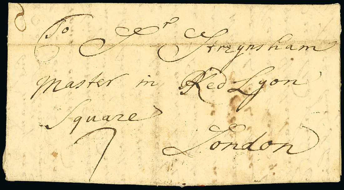 1704 (27 July) entire letter from Admiral Bryng's brother-in-law, Streynsham Master, to his uncle in London and giving a first hand and vivid account of the assault on Gibraltar and its subsequent capture by British forces, three days before, rated "7" and with "se/25" Bishop mark on reverse; the contents include "we drew in to a line of battle & about five in ye morn, we began to bomb & cannonade ye town....Ye Spaniards sprung a mine & blew up ye Castle, ye stones of which as big as mountains fell upon some of our men...crushed some to death...What befell me was one knock on my pate wch made me bend and a great bruise wch confines me to my bed...Abt this time the town capitulated & they are all marching out"