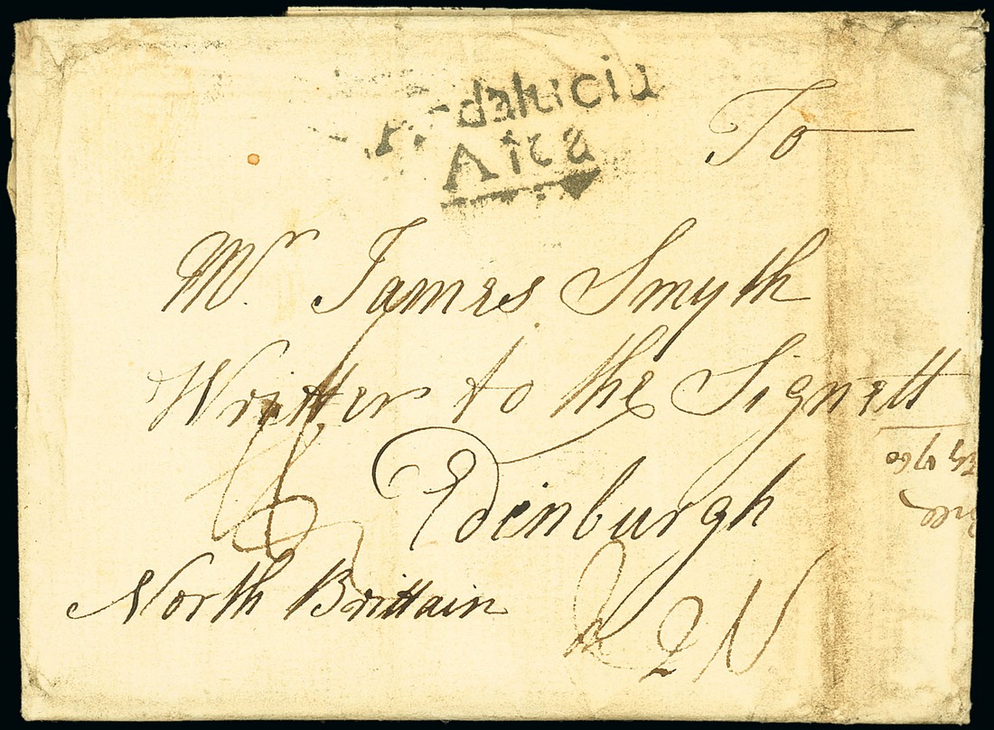 1759 (20 Dec.) entire letter to Edinburgh showing "Andalucia/Alta" handstamp applied at the San Roque Post Office, forwarded by land to La Coruna and then by ship to London, rated "1N2" and with superb red wax seal and Bishop mark on reverse; soiled filing crease on face though one of the earliest known examples sent through this post office. Photo