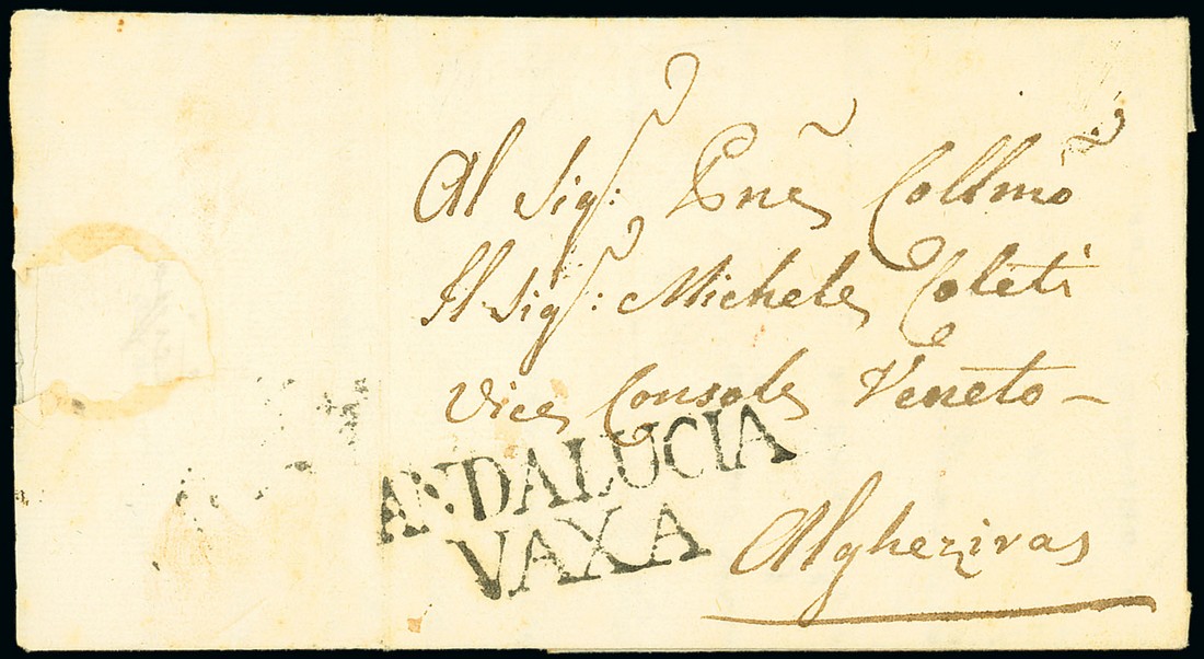 1785 entire letter to Algeciras showing a fine strike of the "andalucia/vaxa" handstamp. Photo
