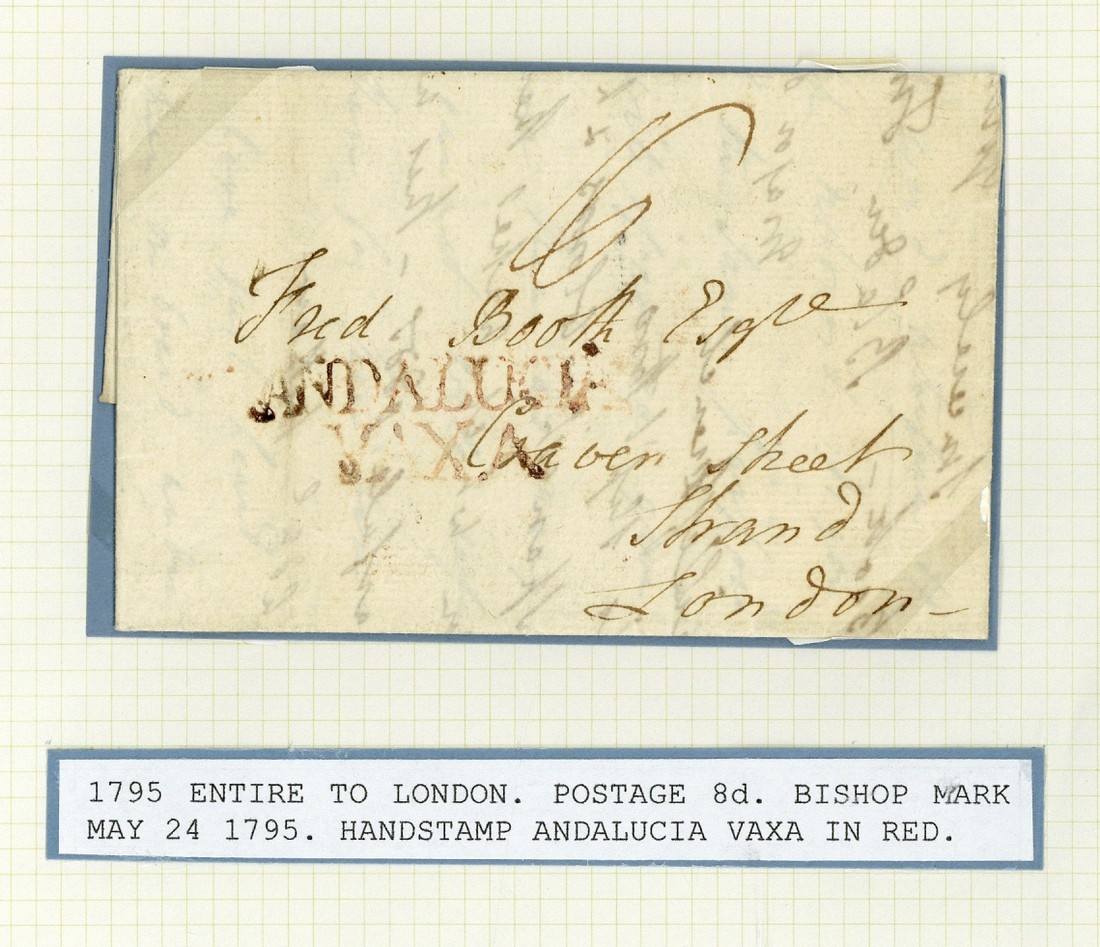 1795 (Apr.) entire letter to London, rated "8" and showing a fine strike of he "andalucia/vaxa" handstamp in red, Bishop mark on reverse. Photo