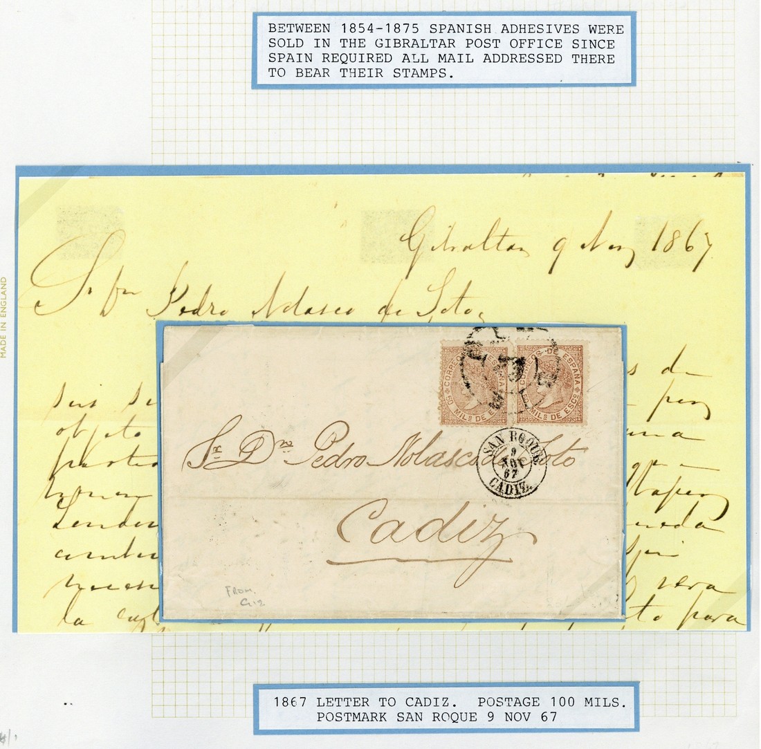 1867 entire letter to Cadiz, bearing Spanish 50m. bistre-brown (2) sharing "rueda" and with superb San Roque c.d.s. (9.11) below, arrival c.d.s. on reverse