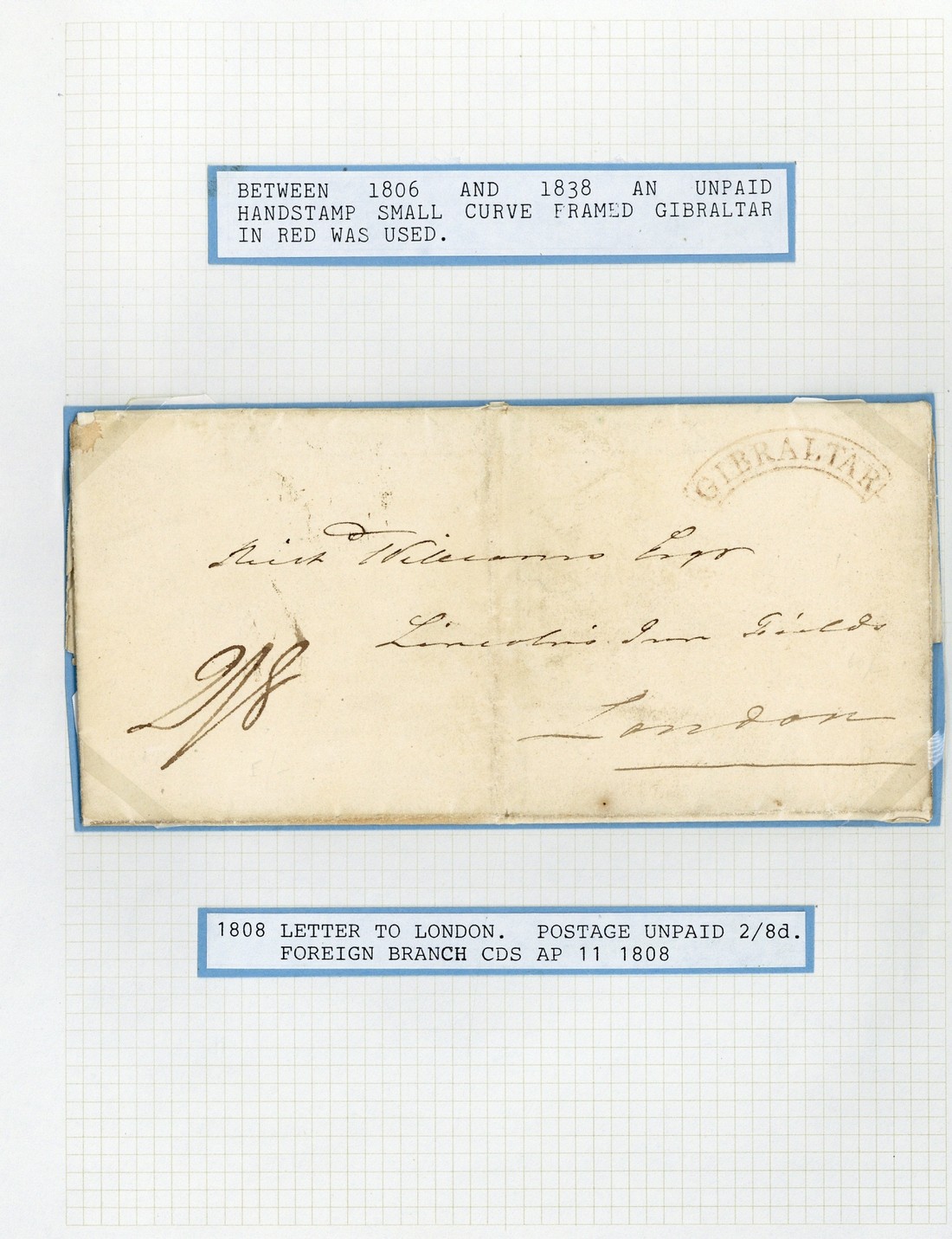 1810 and 1810 entire letters to London rated "2/8" and "3/-" respectively, both showing fine curved-framed "gibraltar" in red