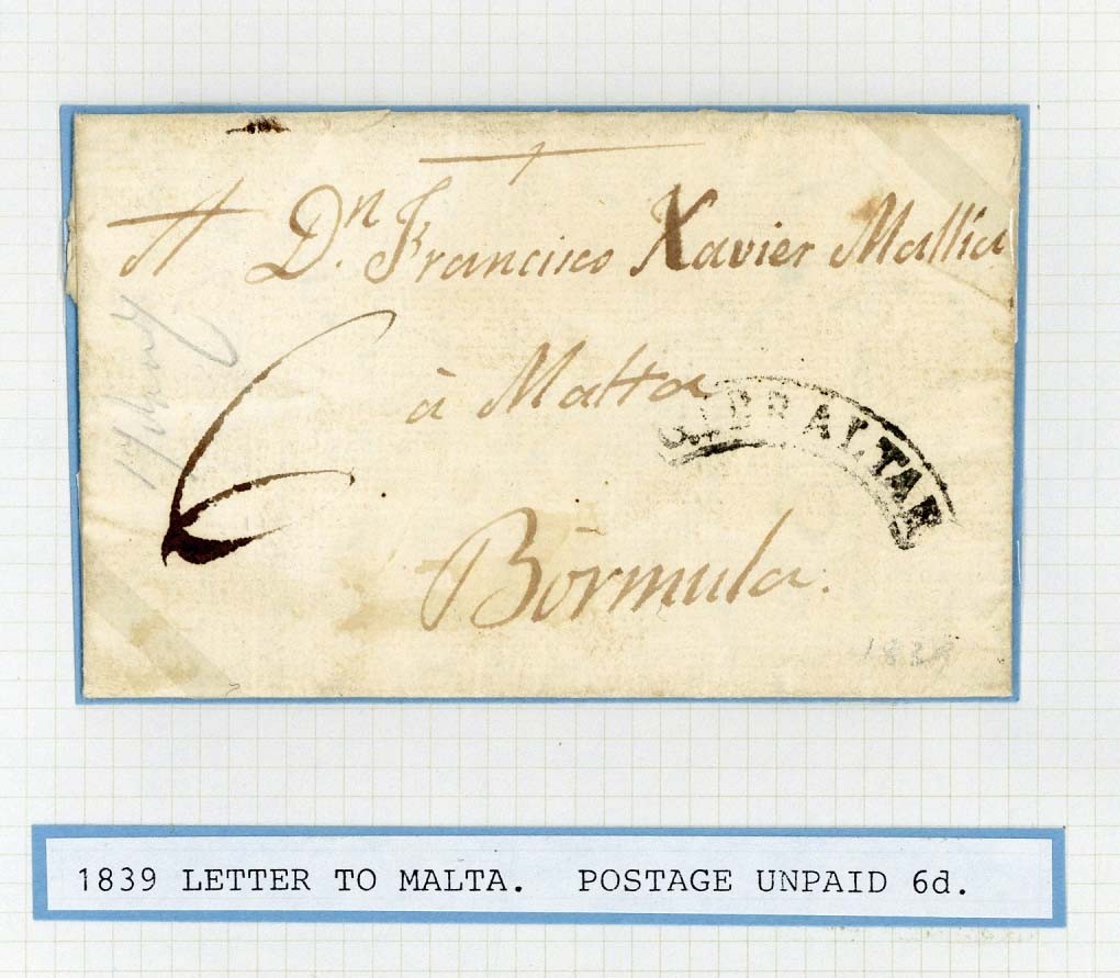 1839 entire letter to Malta rated "6" and 1840 entire letter to Scotland rated "1/-", both with curved-framed "gibraltar", and 1839 entire letter "via Falmouth" to London, rated "1/-" and showing curved-framed "gibraltar" above "paid", curved-framed "foreign paid" in red and London datestamp