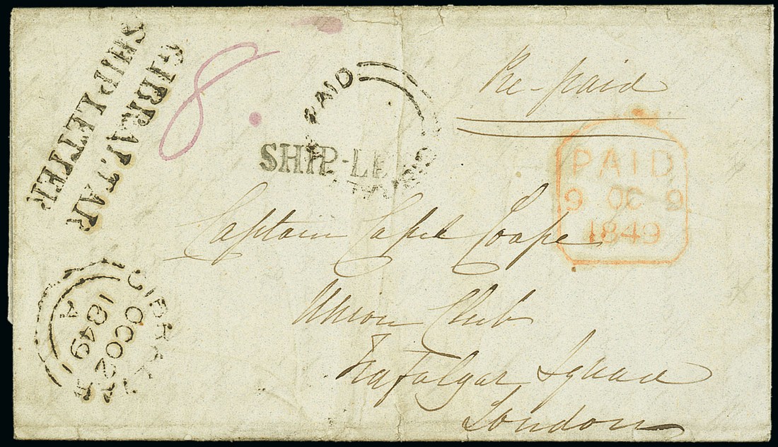 1849 (2 Oct.) entire letter to London rated "8", showing "gibraltar/ship letter", circular-undated "gibraltar paid" and Gibraltar c.d.s. (date error), part London "ship letter" handstamp and arrival datestamp (9.10). Photo