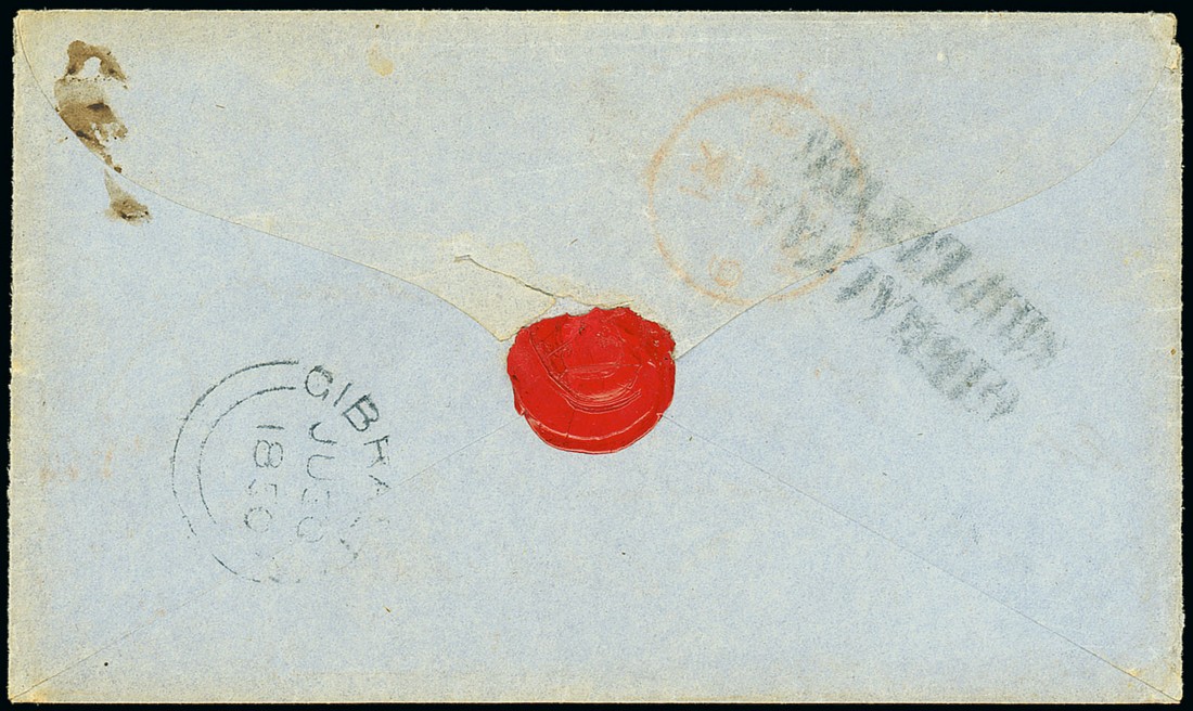 1850 (30 June) envelope "Per Sultan Steamer" to London, rated "8" and showing, on reverse, "gibraltar/ship letter" handstamp (slightly doubled) and c.d.s. in blue, and arrival c.d.s. Photo