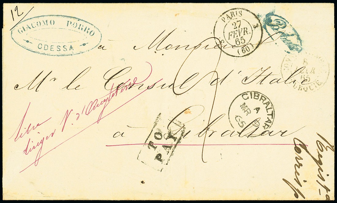 1865 entire (small fault) from Odessa via Constantinople and Paris, showing transit c.d.s. and, upon arrival, framed "to/pay" handstamp and arrival c.d.s. (9.3). Photo