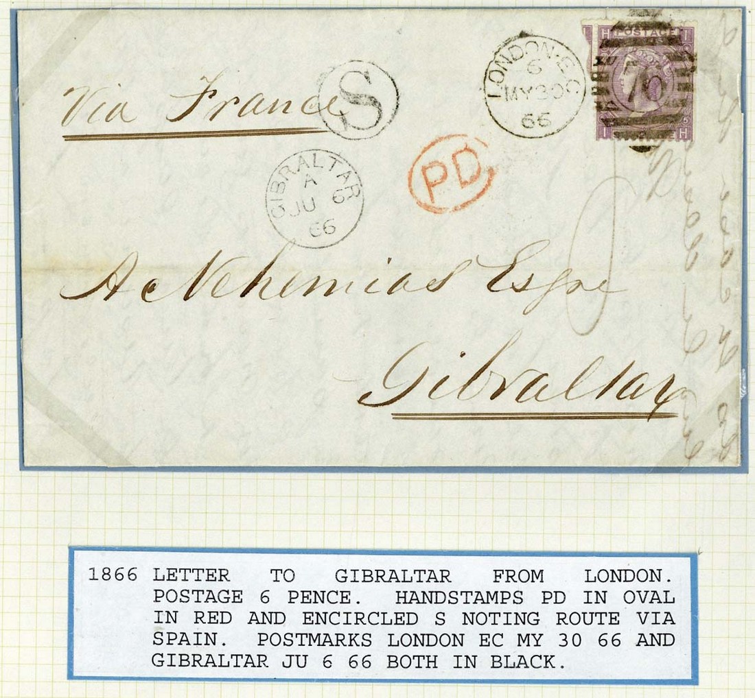 1866 (May) entire letter from London marked "via France" and bearing 6d. lilac with "76" duplex, showing oval-framed "pd", fine circular-framed "S" and Gibraltar c.d.s. (6.6)