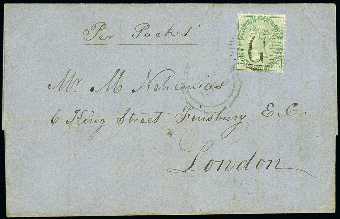 1858 (20 Mar.) entire "Per Packet" to London, bearing 1/- tied by a superb crisp strike and with light despatch c.d.s. in grey-blue alongside, arrival c.d.s. (26.3) on reverse; fine and scarce. Photo