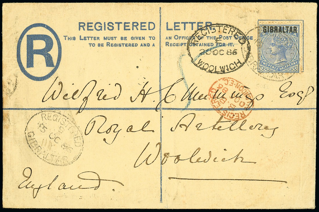 1886 (20 Oct.) 2d. G size registered envelope, uprated by 2½d. with blue-black overprint, lightly tied by Registered oval datestamp and with London (20.10) and Woolwich (20.10) oval registered datestamps alongside; flap damaged and a few other small faults though a very rare stamp on cover. Photo