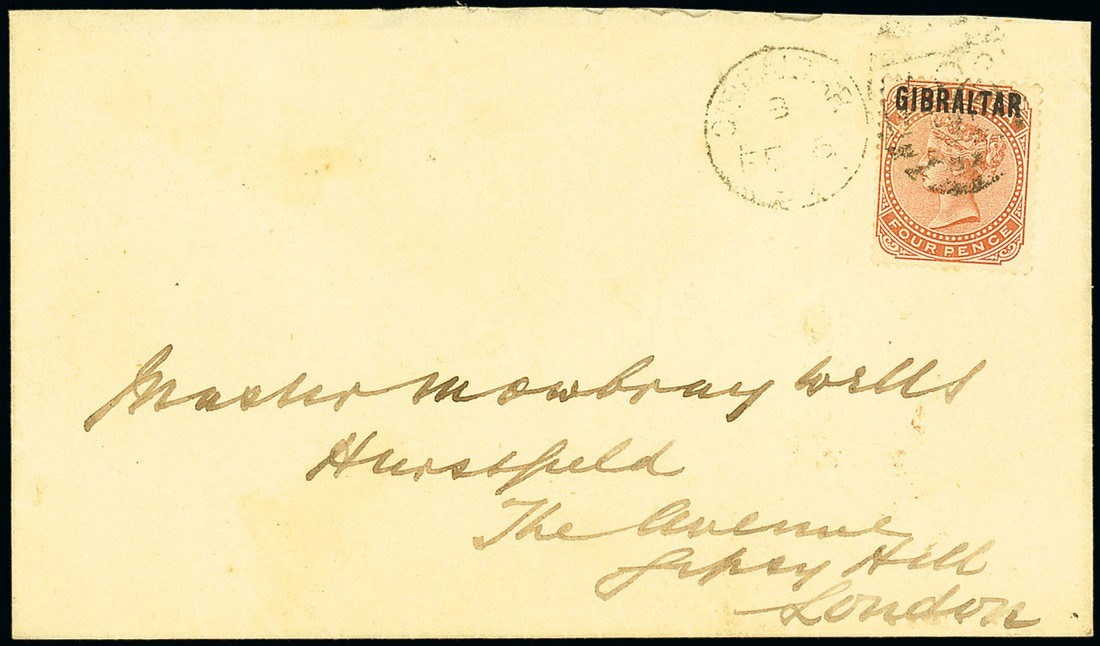 1887 (6 Feb.) envelope to London with Eastern Telegraph Co. embossed seal on flap, bearing 4d. orange-brown lightly cancelled and with part arrival c.d.s. (11.2) on reverse; a scarce stamp used alone on an apparently overpaid franking. Photo