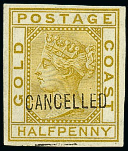 1876-84 CC ½d. olive-yellow imperforate plate proof handstamped "cancelled" (Type D7), no gum, fine. S.G.4. Photo