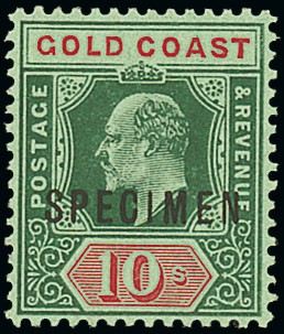 1907-13 MCA 10/- green and red on green overprinted "specimen", fine mint. S.G. 69s, £325. Photo