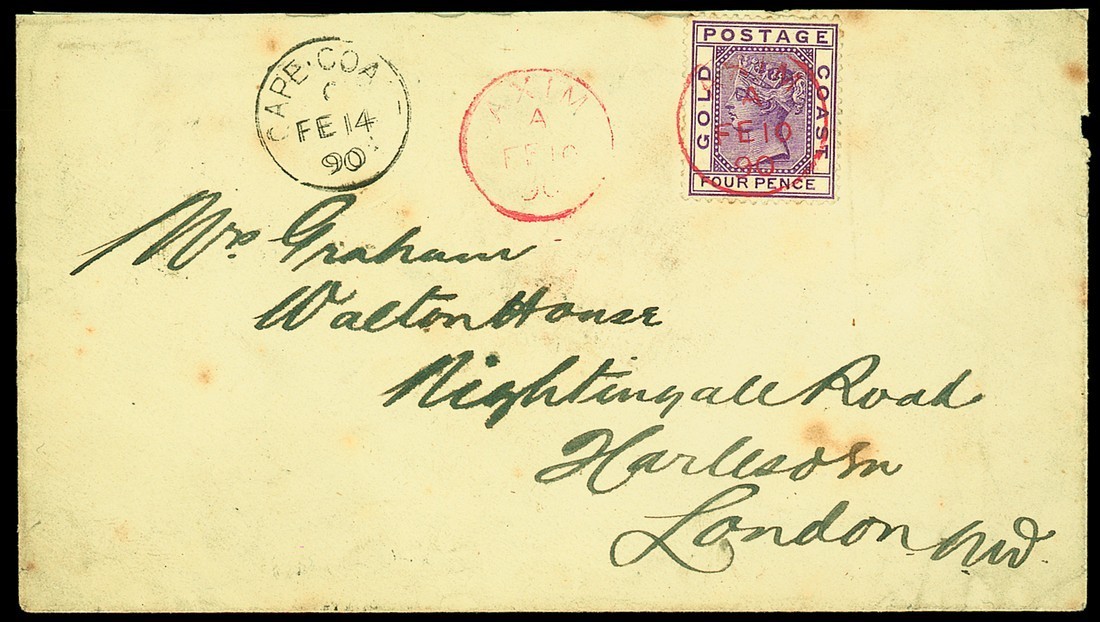 1890 (10 Feb.) envelope to London, bearing 1884-91 4d. deep mauve neatly cancelled with superb "axim" Code A c.d.s. (Type 2) in red, a further strike and Cape Coast Type 2 c.d.s. (14.2) alongside, fine red wax seal with hand holding lamp and London c.d.s. (17.3) on reverse; the envelope with a little foxing though remaining attractive. S.G. 16