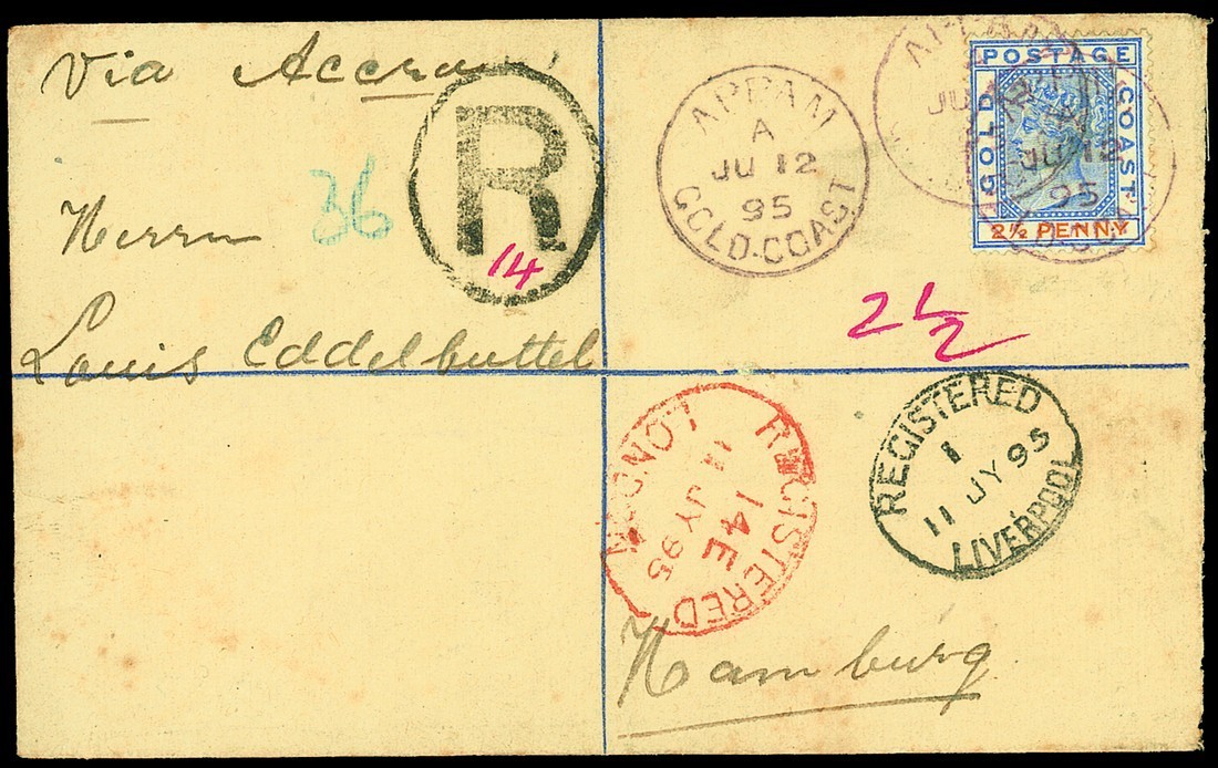 1895 (12 June) 2d. F size registered envelope "Via Accra" to Germany bearing, on reverse, 1884-91 2½d., [59] with short "y", twice cancelled with appam/gold coast" Code A c.d.s. (Type 5) in reddish brown with a further strike alongside, also showing "R" in oval h.s., Liverpool (11.7) and London (11.7) Registered oval d.s., the face panel with Accra (14.6) and Hamburg (12.7) c.d.s.; attractive