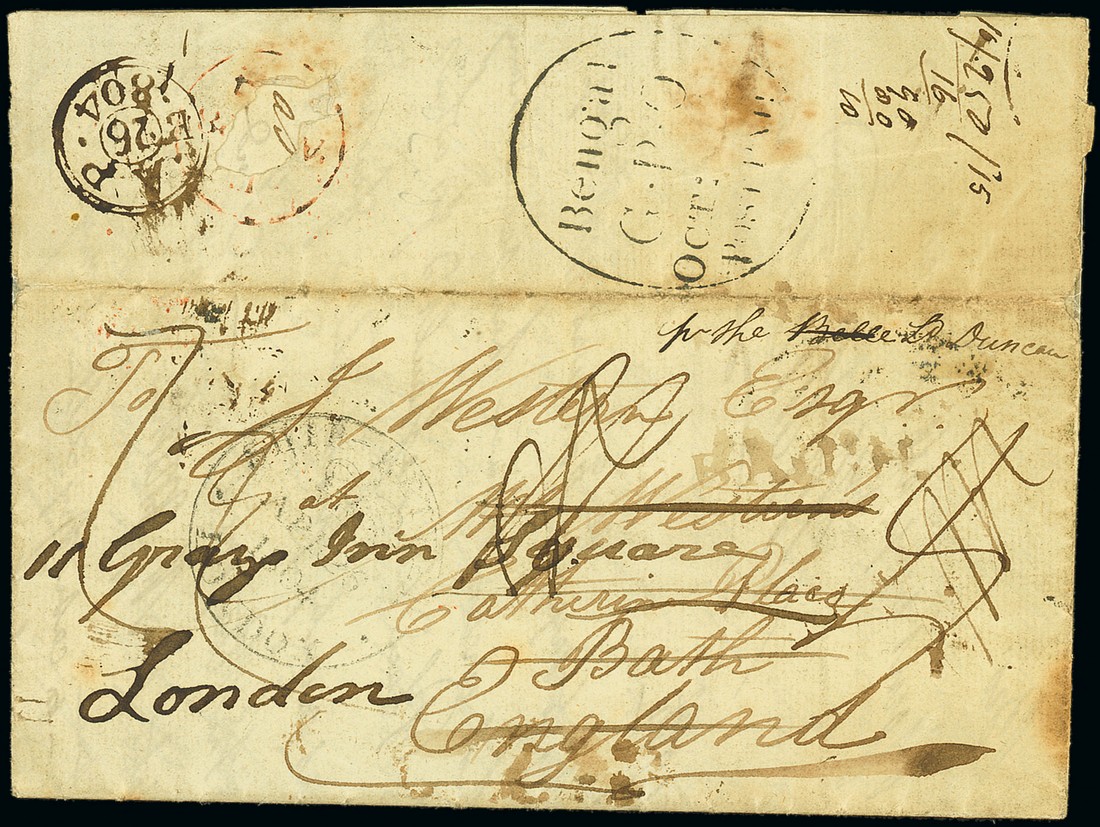 1803 (16 Oct.) entire letter written from "Camp before Agra" by W.B. Western to his brother in Bath and redirected to London showing various markings including Calcutta oval-framed "Bengal/g.p.o./oct:/post paid" and London Ship Letter datestamp. An historic letter from the Second Mahratta War. Photo
