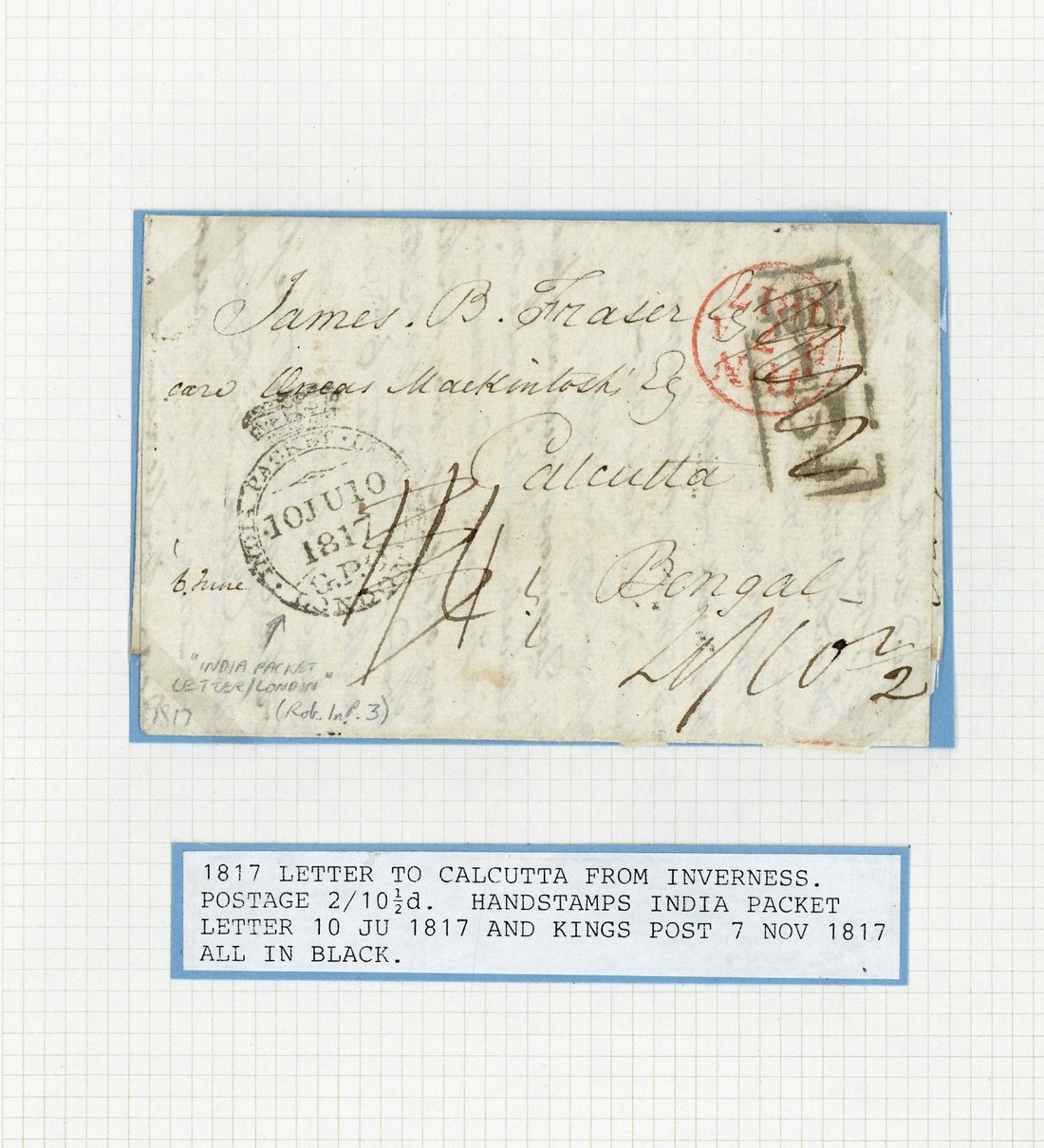 1815-40 entire letters (10) with London Ship letter markings, including 1815 with "post paid withdrawn ship letter" (Robertson P.P.W. 1), 1818 from Ceylon to London with oval "(Crown)/india/packet letter" (In.P.2), 1817 with "(Crown)india packet letter/g.p.o./london" (In. P.3), 1828 from Calcutta to England with "india soldier&c/1/london" (In. Sol. 2), 1836 to London from Cawenpore with "india soldiers/london/3" (In. Sol. 4), 1840 from Dinapore to Ireland with "soldiers & seamans letter/by ship/4" (In. Sol. 7), etc.; strikes and condition mixed though a fine lot with several scarce items