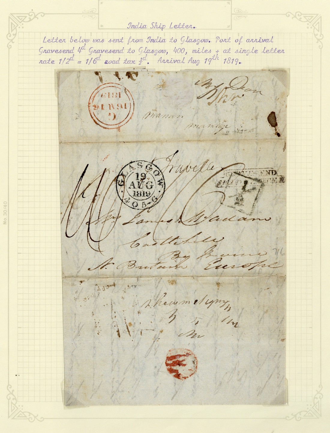 1819-38 entire/entire letters to the U.K., the 1819 item with step-type Gravesend Ship Letter handstamp, the others with India Letter handstamps of Cowes, Dartmouth, Deal (2), Dover, Falmouth, Hastings, Liverpool, London, Lymington, Margate (2), Penzance, Plymouth (2), Portsmouth, Ramsgate and Swanage (2), and a variety of other markings; fair to fine strikes