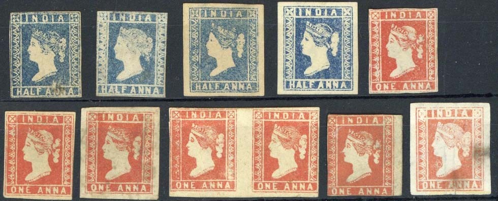 ½a. Die I (2) and II (2), 1a. Die I (6 with a pair) and II, all apparently unused, the ½a. Die II, one 1a. Die I and the Die II with margins all round; a few stains and other faults in places