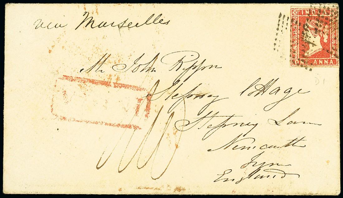 1a. Die I with just clear to large margins, neatly cancelled by diamond of dots on 1855 (31 Mar.) envelope from Quetta "via marseilles" to England. Photo