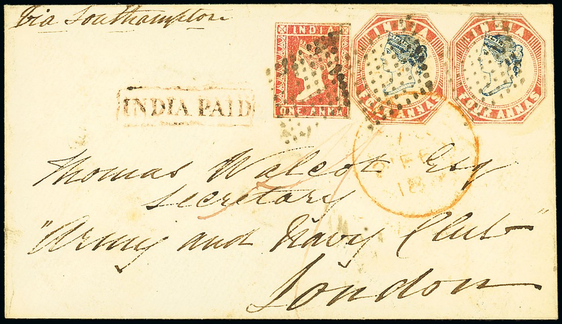 4a. 1st printing (2, both cut to shape) plus 1a. Die I on 1855 envelope to London, marked "Via Southampton", all cancelled by diamond of dots, showing framed "india paid" and Paid arrival c.d.s. (tying the 4a.). Attractive. Photo