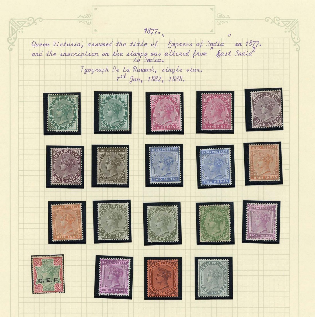 1882-1988 mint collection including Q.V. to 5r. with ten values overprinted "specimen", 1921 9p. on 1a. interpanneau block of eight with "pies/pies" and "nine/nine" varieties, 1926 15r., 1929 Air set with 8a. variety missing tree top, 1931 Delhi set with ½a. "f" for "p" variety, 1937-40 set less 15r., 1958 Map coil strips of six values, a few later varieties, Indo-Chine 1957 three different 2n.p. values in blocks of sixty-three, Chalo Delhi 1p. maroon and Azad Hind labels (14). Condition a little mixed in places though an interesting lot400