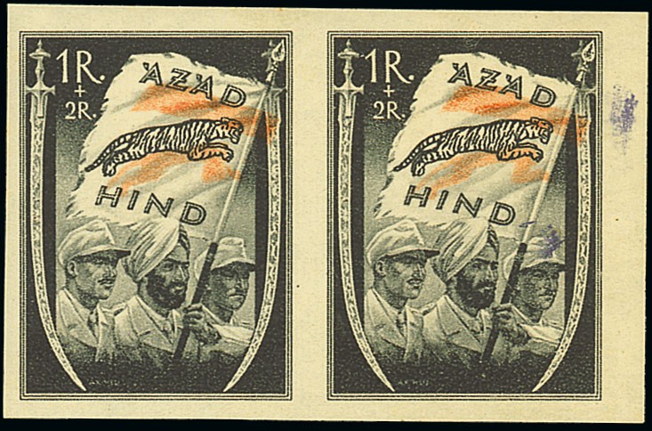 1943 Azad Hind 1r. imperforate pair in black and orange, large part gum; small violet mark on right-hand stamp and in margin. Michel VIIB, €500. Photo