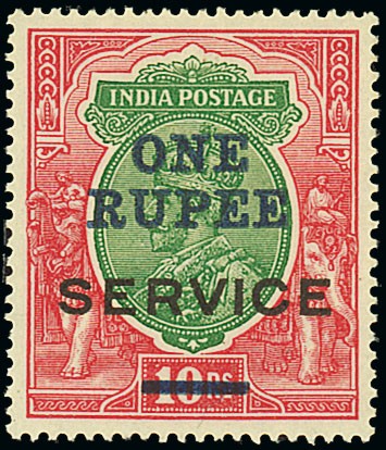 — 1r. in blue on 10r. (Type 22); minor colour suffusion, otherwise fine. Photo