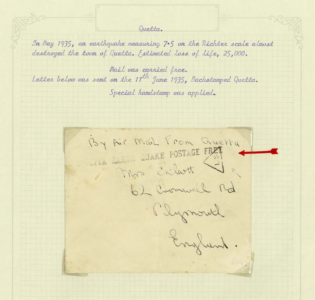 1935 Quetta Earthquake selection of unstamped envelopes (10), three with manuscript notations, one with large part "Quetta Earth Queke, Postage Free." handstamp in red and six with "quetta earth quake postage free" handstamp in black; also 1935 (July) North West Railway magazine Supplement with photos of the quake damage and a listing of all railway employees killed by the quake