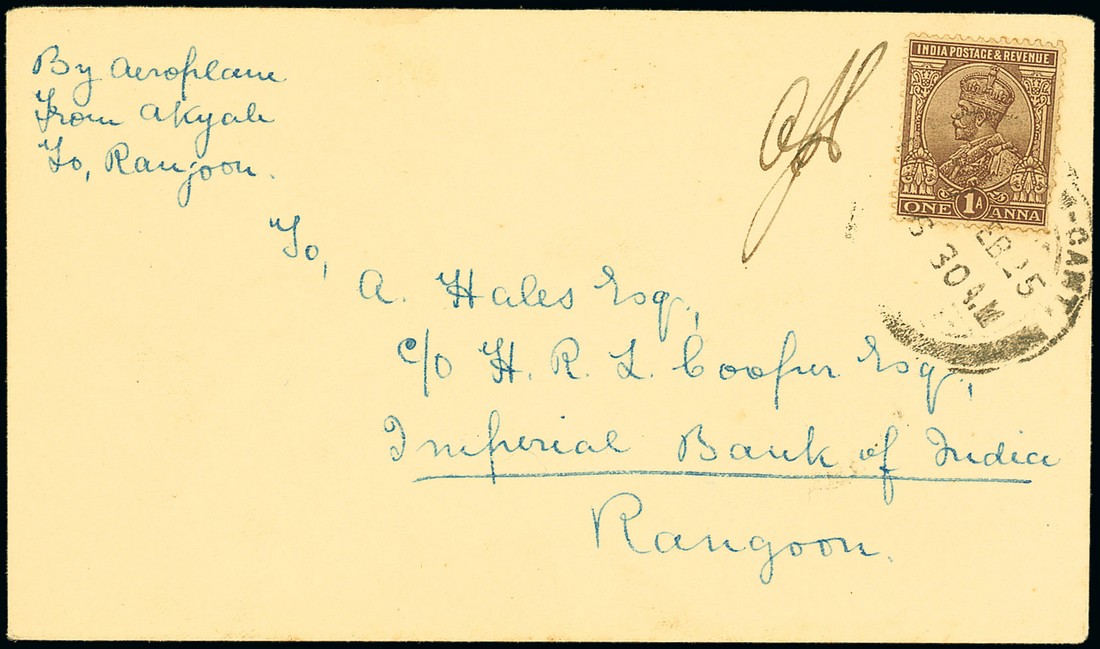 1920 (7 Feb.) Anglo-Indian Survey flight by Alan Cobham, envelope "By aeroplane from Akyab to Rangoon" bearing 1a. with indistinct c.d.s. and initialled "AJC" alongside, arrival c.d.s. on reverse. Photo