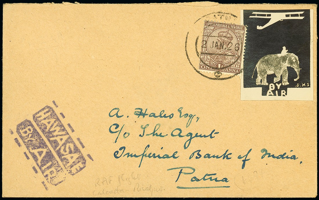1926 (2 Jan.) Calcutta-Rislapur R.A.F. flight, envelope to Patna bearing 1a. and aeroplane of elephant photographic label sharing c.d.s. and with "hawasae/by air" cachet in violet at foot. Photo